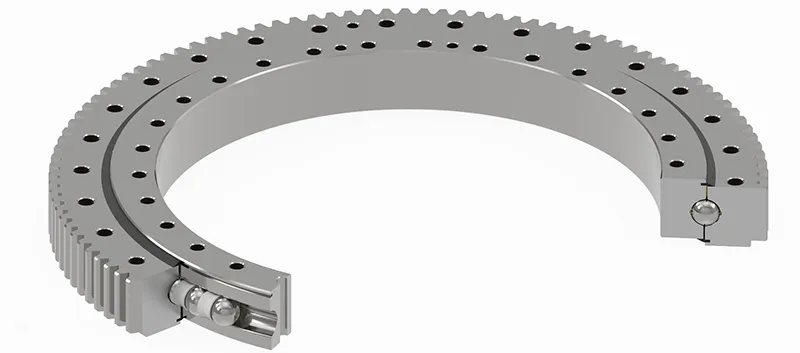 双排球回转支承产品是滚动体与滚道为点接触,双列钢球分别承受上下方向的载荷。此类结构对安装精度以及座架的变形敏感较小,可靠性好,对不利环境的容差能力强。