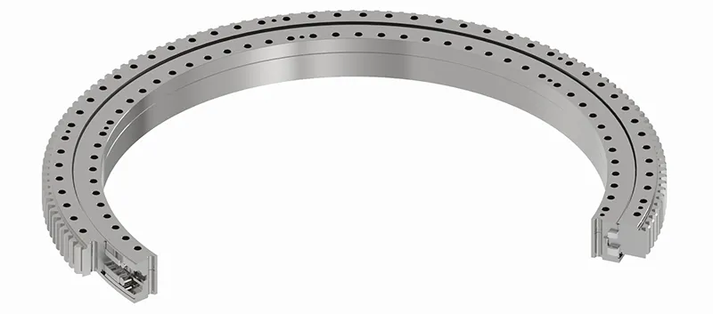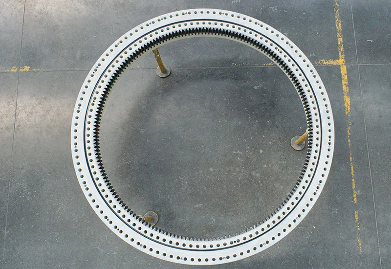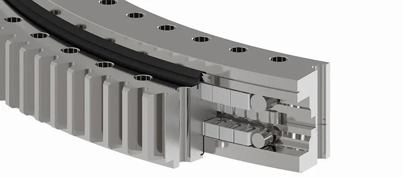 三排圆柱滚子回转支承是滚动体与滚道为线接触,刚性好回转稳定,是一种综合承载能力最强的回转支承,既能同时承受轴向载荷、径向载荷、倾覆力矩,也能承受单个载荷,因三排滚道各自承受不同的载荷,能满足不同组合载荷。对安装座架精度的变形较为敏感。