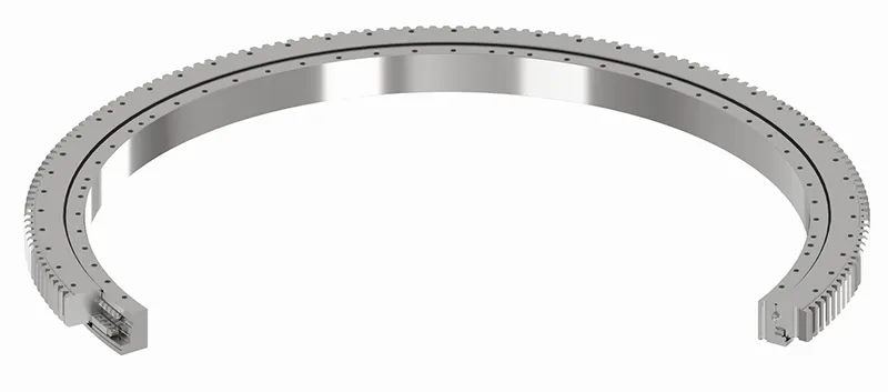 四点接触球回转支承是滚动体与滚道为点接触,结构紧凑回转灵活,既能同时承受轴向载荷、径向载荷、倾覆力矩,也能承受单个方向载荷。在满足相同工况载荷下,四点球回转支承具有截面尺寸小,重量轻的优点。
