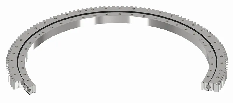 交叉圆柱滚子回转支承滚动体与滚道为线接触,刚性较好,回转相对稳定,既能同时承受轴向载荷、径向载荷、倾覆力矩,也能承受单个方向载荷。理论动负荷较高,承受冲击载荷的能力好。但滚动体运转中摩擦阻力相对较大,旋转速度低。内部间隙小,对安装座架精度的变形较为敏感。