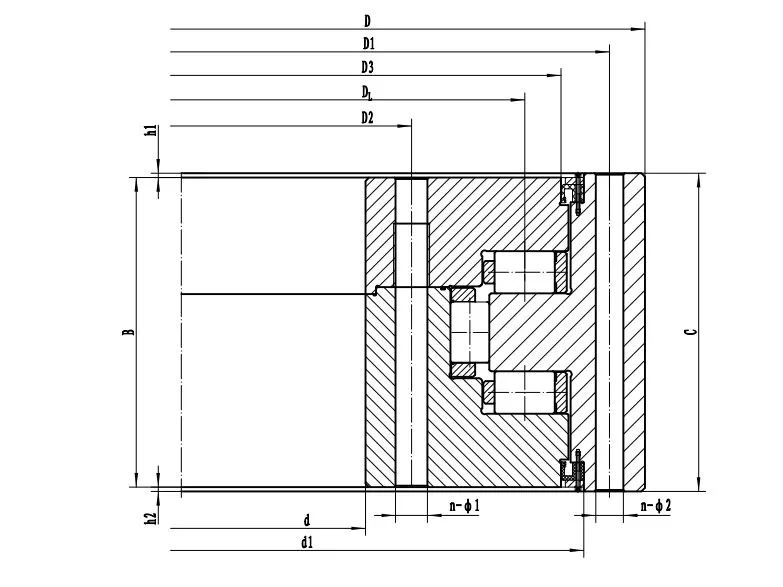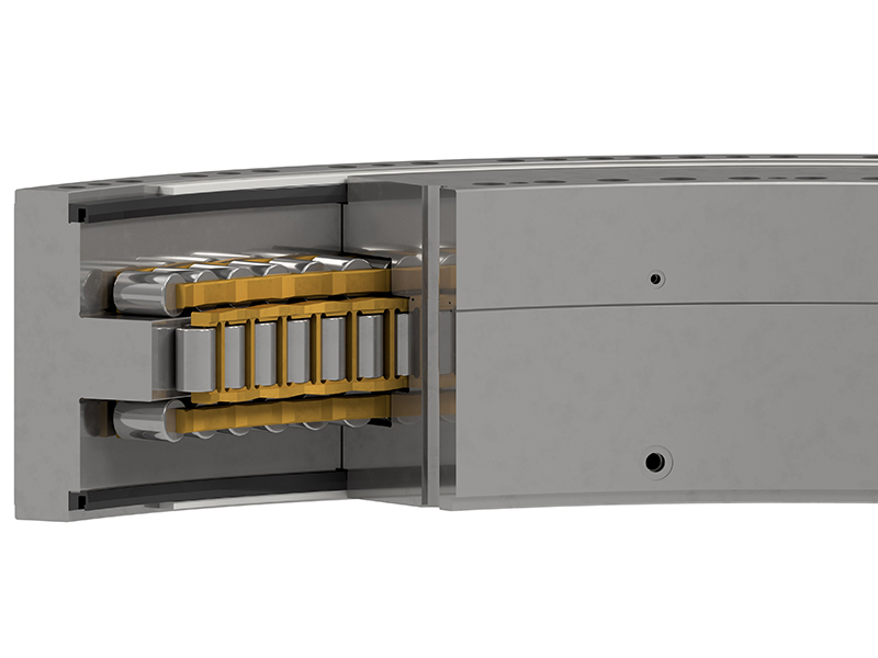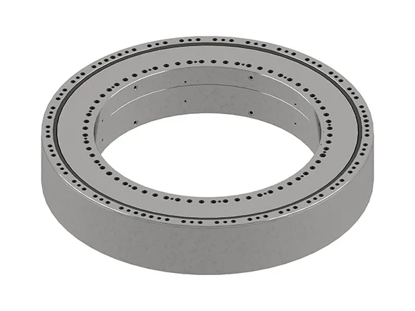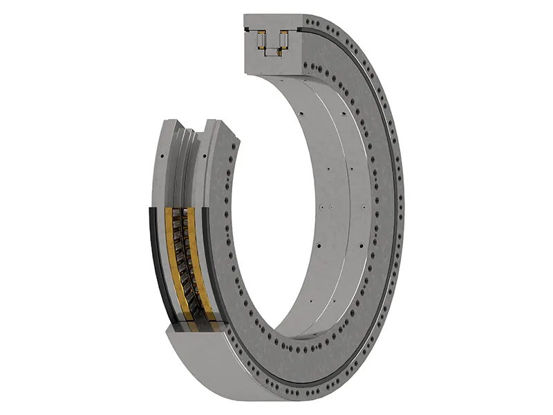 三排滚柱式主轴承结构上由两排推力滚子和一排径向滚子组成,一般有外圈组合内圈整体和外圈整体内圈组合两种结构其结构;由于结构强度大、承载能力强,故多用于直驱式风力发电机等,可抵御风机气动载荷产生的轴向力、径向力和倾覆力矩。轴承各部位滚子承载力分工明确,充分发挥各承载滚子的承载效能,具有较大的轴向力、径向力和倾覆力矩的承载能力及刚性,受载后轴承变形小,安全系数高,可靠性高;内部采用合金保持架,结构强度高,耐磨性能优,发热小。