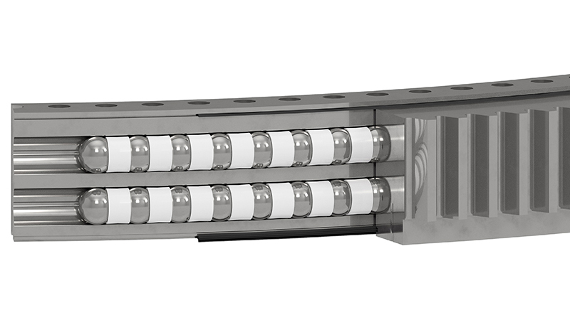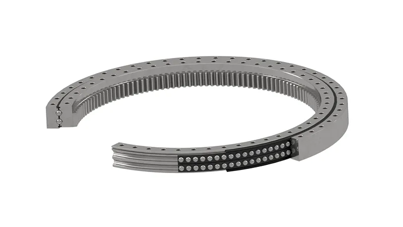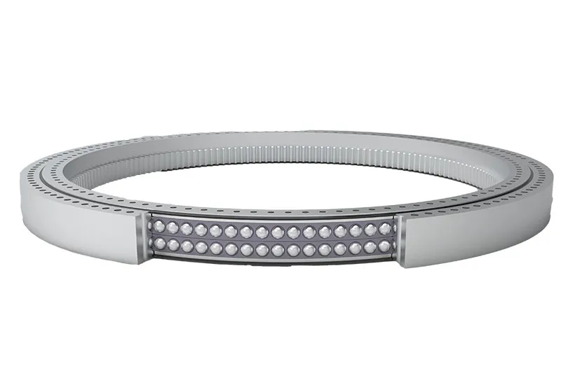 双排四点接触球变桨轴承是一种特殊设计的大型回转支承轴承,主要用于风力发电机组中变桨机构的核心部位。这种轴承的特点是拥有两排钢球,滚道采用四点接触结构,因此得名双排四点接触球轴承。双排四点接触球轴承拥有上下两排钢球,每排钢球均通过相应的滚道和保持架来引导和支撑,使得整个轴承能够同时承载较大的轴向载荷和径向载荷,而且由于其“四点接触”结构设计,可以在一定角度范围内提供稳定的支承,适合于变桨机构中叶片需不断调整桨距的需求。